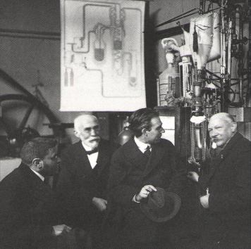 Heike Kamerlingh Onnes (far right) shows his helium liquefactor to three theoretical physicists: Niels Bohr (visiting from Kopenhagen), Hendrik Lorentz, and Paul Ehrenfest (far left)