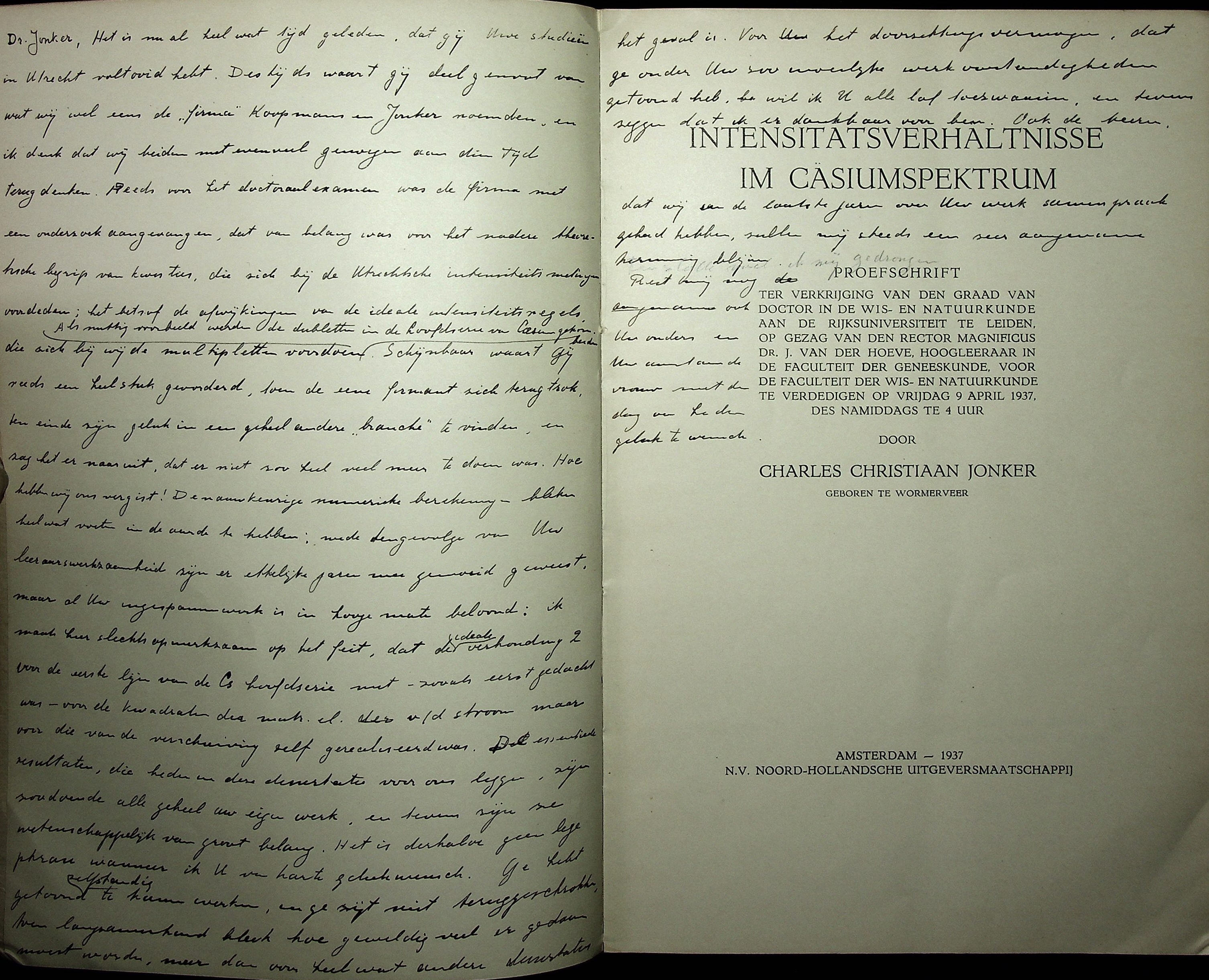 Laudatio uitgesproken door H.A. Kramers op 9 april 1937, bij de promotie van Charles Christiaan Jonker. Dr. Jonker, Het is nu al heel wat tijd geleden, dat gij Uwe studien in Utrecht voltooid hebt. Destijds waart gij deelgenoot van wat wij wel eens de "firma" Koopmans en Jonker noemden, en ik denk dat wij beiden met evenveel genoegen aan dien tijd terugdenken. Reeds voor het doctoraalexamen was de firma met een onderzoek aangevangen, dat van belang was voor het nadere theoretische begrip van kwesties, die zich bij de Utrechtsche intensiteitsmetingen voordeden; het betrof de afwijkingen van de ideale intensiteitsregels die zich bij wijde multipletten voordoen. Als nuttig voorbeeld werden de dubletten in de hoofdserie van Caesium gekozen. Schijnbaar waart gij beiden reeds een heel stuk gevorderd, toen de eene firmant zich terugrok, ten einde zijn geluk in een geheel andere "branche" te vinden, en zag het er naar uit, dat er niet zoo heel veel meer te doen was. Hoe hebben wij ons vergist! De nauwkeurige numerieke berekeningen bleken heel wat voeten in de aarde te hebben: mede ten gevolge van uw leeraarswerkzaamheid zijn er ettelijke jaren mee gemoeid geweest, maar al Uw ingespannen werk is in hooge mate beloond: ik maak hier slechts opmerkzaam op het feit, dat de ideale verhouding 2 voor de eerste lijn van de Cs hoofdserie niet – zooals eerst gedacht was – voor de kwadraten der matr.el. [matrixelementen] v/d stroom maar voor die van de verschuiving zelf gerealiseerd was. De essentiele resultaten, die heden in deze dissertatie voor ons liggen, zijn zoodoende alle geheel Uw eigen werk, en tevens zijn ze wetenschappelijk van groot belang. Het is derhalve geen lege phrase wanneer ik U van harte gelukwensch. Ge hebt getoond zelfstandig te kunnen werken, en ge zijt niet teruggeschrokken, toen langzamerhand bleek hoe geweldig veel er gedaan moest worden, meer dan voor heel wat andere dissertaties het geval is. Voor het doorzettingsvermogen, dat ge onder Uw zoo moeilijke werkomstandigheden getoond heb(t), wil ik U alle lof toezwaaien, en tevens zeggen dat ik er dankbaar voor ben. Ook de keeren dat wij de laatste jaren over Uw werk samenspraak gehad hebben, zullen mij steeds een zeer aangename herinnering blijven. Ten slotte voel ik mij gedrongen ook Uw ouders en Uw aanstaande vrouw met de dag van heden geluk te wenschen. |
