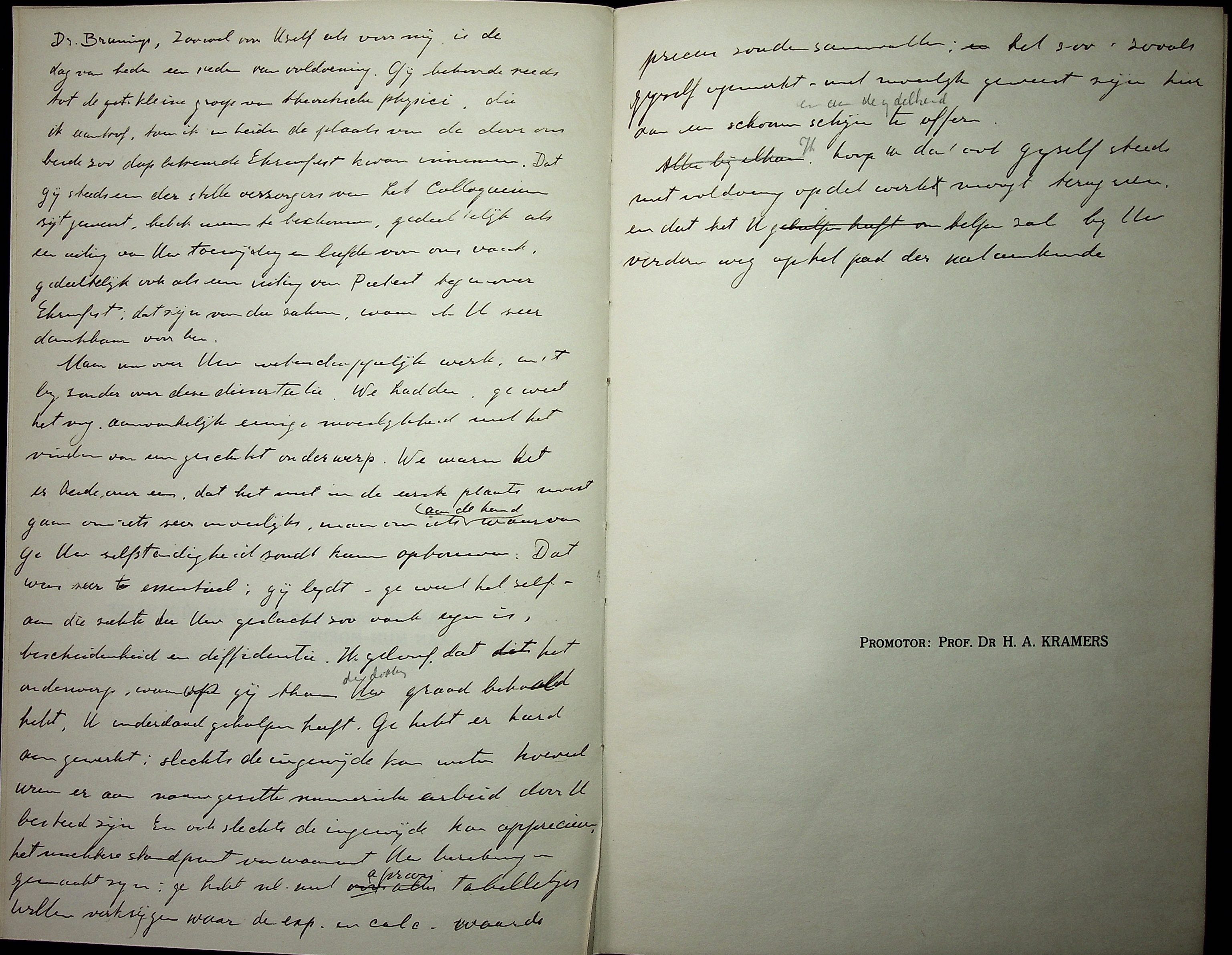 Laudatio uitgesproken door H.A. Kramers op 20 januari 1938, bij de promotie van Johanna Hildegonda Margaretha Brunings. Dr. Brunings, Zoowel voor Uzelf als voor mij is de dag van heden een reden van voldoening. Gij behoorde reeds tot de kleine groep van theoretische physici, die ik aantrof, toen ik in Leiden de plaats van de door ons beide zoo diep betreurde Ehrenfest kwam innemen. Dat gij steeds een der stille verzorgers van het Colloquium zijt geweest, heb ik weten te beschouwen, gedeeltelijk als een uiting van Uw toewijding en liefde voor ons vak, gedeeltelijk ook als een uiting van pieteit tegenover Ehrenfest; dat zijn van die zaken, waar ik U zeer dankbaar voor ben. Maar nu over Uw wetenschappelijk werk, in 't bijzonder over deze dissertatie. We hadden, ge weet het nog, aanvankelijk eenige moeilijkheid met het vinden van een geschikt onderwerp. We waren het er beide over eens, dat het niet in de eerste plaats moest gaan om iets zeer moeilijks, maar om iets aan de hand waarvan ge uw zelfstandigheid zoudt kunnen opbouwen. Dat was zeer essentieel; gij lijdt – ge weet het zelf – aan die ziekte die Uw geslacht zoo vaak eigen is, bescheidenheid en diffidentie. Ik geloof, dat het onderwerp, waarop gij thans den doctorsgraad gehaald hebt, u inderdaad geholpen heeft. Ge hebt er hard aan gewerkt; slechts de ingewijde kan weten hoeveel uren er aan nauwgezette numerieke arbeid door u besteed zijn. En ook slechts de ingewijde kan apprecieren, het nuchtere standpunt van waaruit Uw berekeningen gemaakt zijn; ge hebt nl. niet a priori tabelletjes willen verkrijgen waar de exp. en calc. waarde precies zouden samenvallen; het zou, zooals gijzelf opmerkt, niet moeilijk geweest zijn hier aan een schoone schijn en aan de ijdelheid te offeren. Ik hoop dan ook (dat) gijzelf steeds met voldoening op dit werk moogt teruzien, en dat het U helpen zal bij Uw verdere weg op het pad der natuurkunde. |