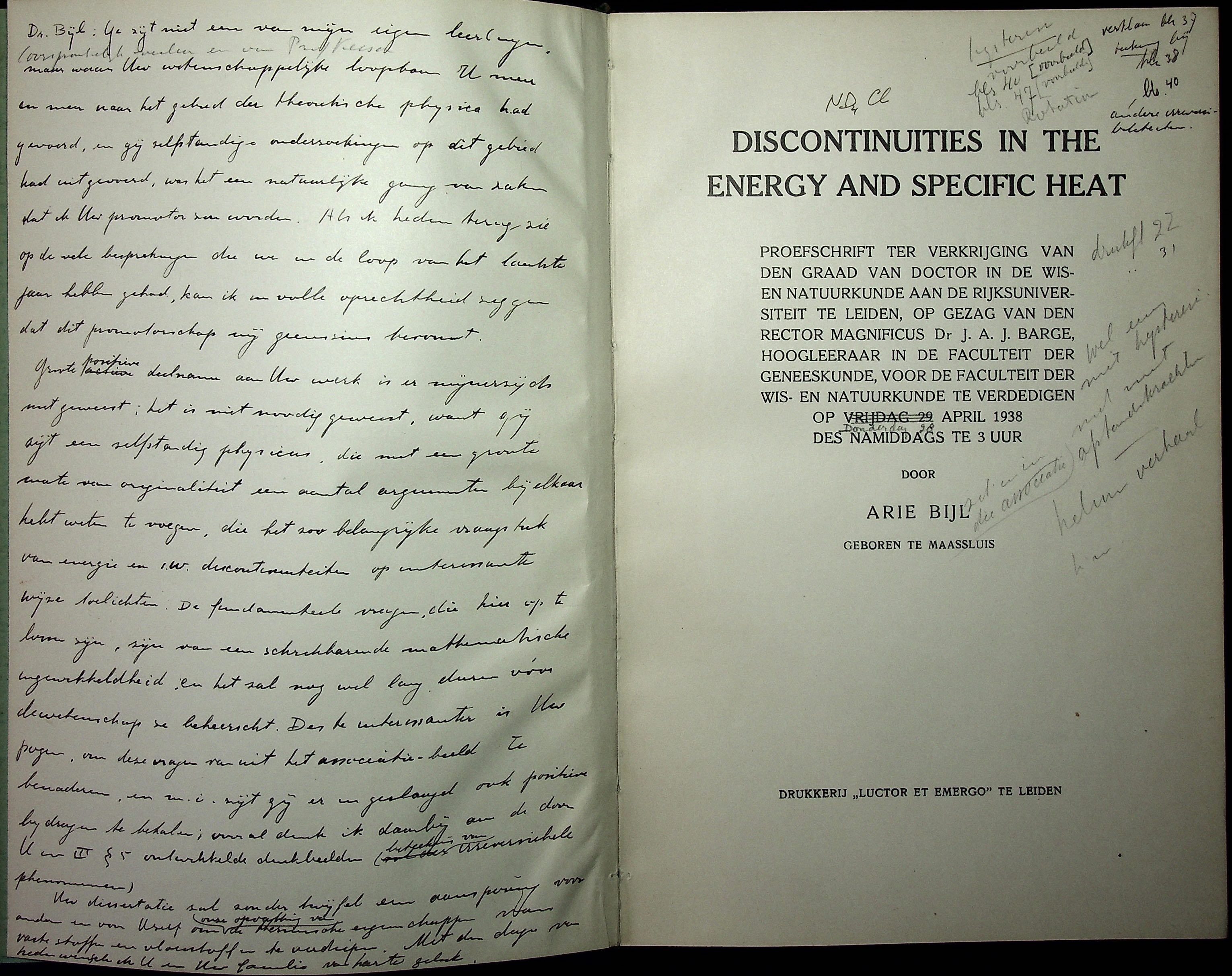 Laudatio uitgesproken door H.A. Kramers op 28 april 1938, bij de promotie van Arie Bijl. Dr. Bijl: Ge zijt niet een van mijn eigen leerlingen (oorspronkelijk veeleer een van Prof. Keesom), maar waar Uw wetenschappelijke loopbaan u meer en meer naar het gebied der theoretische physica had gevoerd, en gij zelfstandige onderzoekingen op dit gebied had uitgevoerd, was het een natuurlijke gang van zaken dat ik Uw promotor zou worden. Als ik heden terugzie op de vele besprekingen die we in de loop van het laatste jaar hebben gehad, kan ik in volle oprechtheid zeggen dat dit promotorschap mij geenszins berouwt. Grote positieve deelname aan Uw werk is er mijnerzijds niet geweest: het is niet noodig geweest, want gij zijt een zelfstandig physicus, die met een groote mate van originaliteit een aantal argumenten bij elkaar hebt weten te voegen, die het zoo belangrijke vraagstuk van energie en s.w. (soortgelijke warmte) discontinuïteiten op interessante wijze toelichten. De fundamenteele vragen, die hier op te lossen zijn, zijn van een schrikbarende mathematische ingewikkeldheid; en het zal nog wel lang duren voor de wetenschap ze beheerscht. Des te interessanter is Uw pogen, om deze vragen van uit het associatie-beeld te benaderen; en m.i. zijt gij er in geslaagd ook positieve bijdragen te behalen; vooral denk ik daarbij aan de door U in III §5 ontwikkelde denkbeelden (beteekenis van irreversiebele phenomenen). Uw dissertatie zal zonder twijfel een aansporing voor anderen en voor uzelf (zijn) om onze opvatting van de thermische eigenschappen van vaste stoffen en vloeistoffen te verdiepen. Met den dag van heden wensch ik U en Uw familie van harte geluk. |