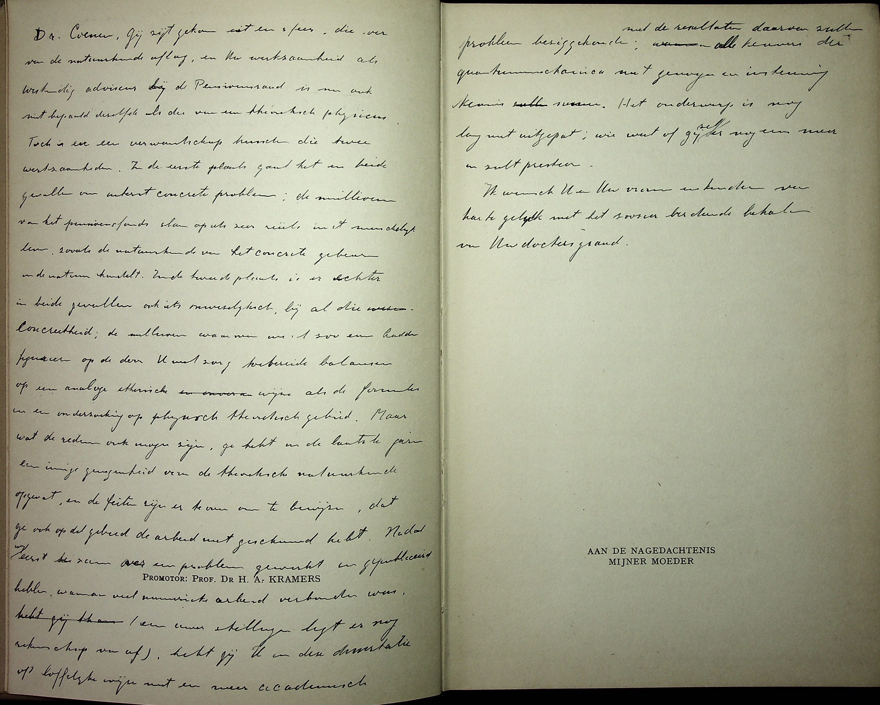 Laudatio uitgesproken door H.A. Kramers op 4 april 1939, bij de promotie van Pierre Alexandre Coenen. Dr. Coenen, gij zijt gekomen uit een sfeer, die ver van de natuurkunde aflag, en Uw werkzaamheid als wiskundig adviseur bij de Pensioensraad is nu ook niet bepaald dezelfde als die van een theoretisch physicus. Toch is er een verwantschap tusschen die twee werkzaamheden. In de eerste plaats gaat het in beide gevallen om uiterst concrete problemen: de millioenen van het pensioensfonds slaan op iets zeer re&eauml;els in 't menschelijk leven, zooals de natuurkunde van het concrete gebeuren in de natuur handelt. In de tweede plaats is er echter in beide gevallen ook iets onwezenlijksch, bij al die concreetheid; de millioenen waarover we 't zoo even hadden figureren op de door U met zorg toebereide balansen op een analoge etherische wijze als de formules in een onderzoeking op physisch theoretisch gebied. Maar wat de redenen ook mogen zijn, ge hebt in de laatste jaren een innige genegenheid voor de theoretische natuurkunde opgevat, en de feiten zijn er te over om te bewijzen, dat ge ook op dit gebied de arbeid niet geschuwd hebt. Nadat wij eerst tezaamen over een probleem gewerkt en gepubliceerd hebben, waaraan veel numerieke arbeid verbonden was (een uwer stellingen legt er nog rekenschap van af), hebt gij U in deze dissertatie op loffelijke wijze met een meer academisch probleem beziggehouden; met de resultaten daarvan zullen alle kenners der quantummechanica met genoegen en instemming kennis nemen. Het onderwerp is nog lang niet uitgeput; wie weet of gij zelf er nog eens meer in zult presteeren. Ik wensch U en Uw vrouw en kinderen van harte geluk met het zoozeer verdiende behalen van Uw doctorsgraad. |