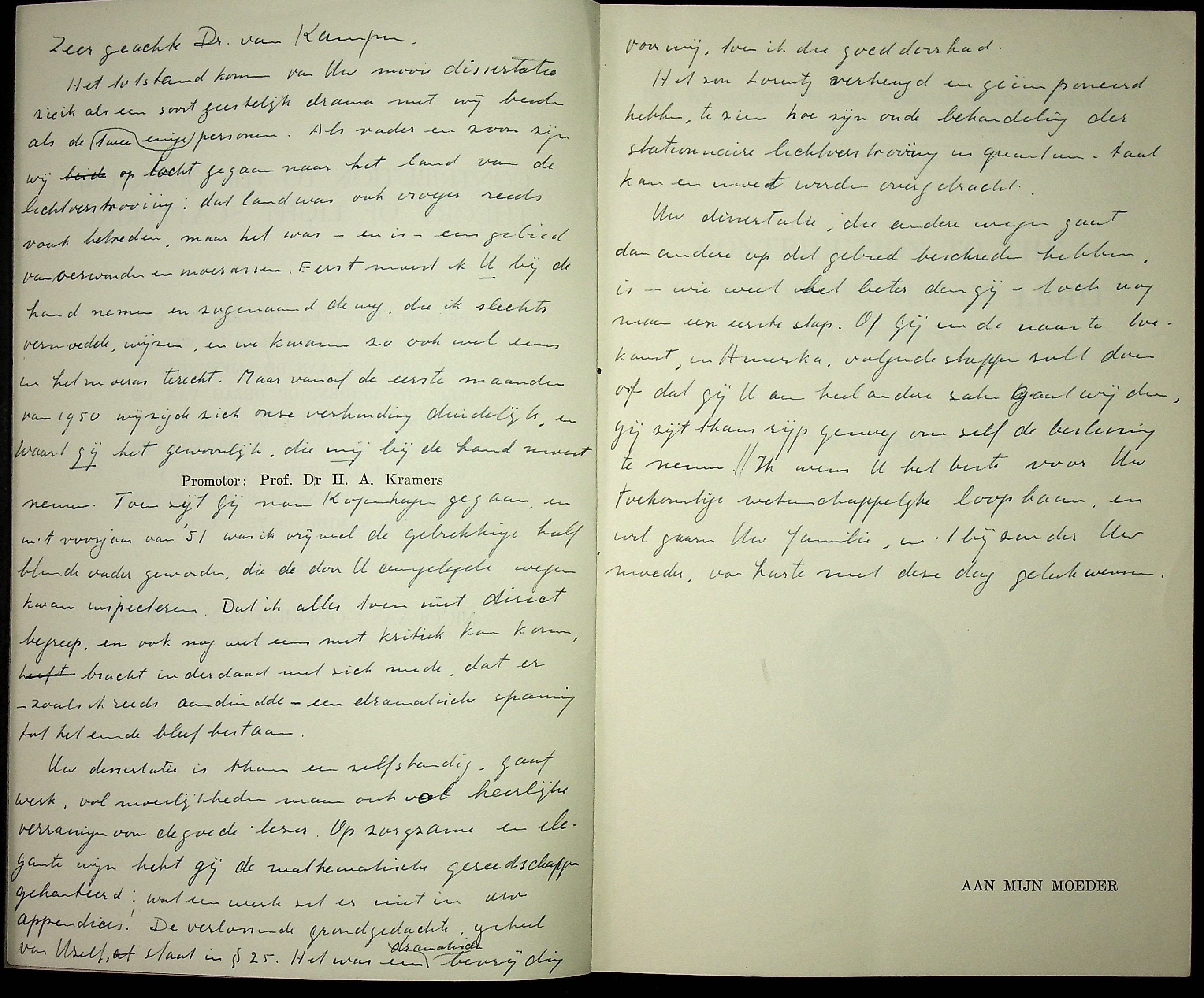 Laudatio uitgesproken door H.A. Kramers op 16 januari 1952, bij de promotie van Nicolaas Godfried van Kampen. Zeer geachte Dr. van Kampen. Het tot stand komen van Uw mooie dissertatie zie ik als een soort geestelijk drama met wij beiden als de enige twee personen. Als vader en zoon zijn wij op tocht gegaan naar het land van de lichtverstrooiing: dat land was ook vroeger reeds vaak betreden, maar het was – en is – een gebied van oerwouden en moerassen. Eerst moest ik U bij de hand nemen en zogenaamd de weg, die ik slechts vermoedde, wijzen, en we kwamen zo ook wel eens in het moeras terecht. Maar vanaf de eerste maanden van 1950 wijzigde zich onze verhouding duidelijk, en waart gij het gewoonlijk, die mij bij de hand moest nemen. Toen zijt gij naar Kopenhagen gegaan, en in 't voorjaar van '51 was ik vrijwel de gebrekkige half blinde vader geworden, die de door U aangelegde wegen kwam inspecteren. Dat ik alles toen niet direct begreep, en ook nog wel eens met kritiek kon komen, bracht inderdaad met zich mede, dat er – zoals ik reeds aanduidde – een dramatische spanning tot het einde bleef bestaan. Uw dissertatie is thans een zelfstandig, gaaf werk, vol moeilijkheden maar ook vol heerlijke verrassingen voor de goede lezer. Op zorgzame en elegante wijze hebt gij de mathematische gereedschappen gehanteerd: wat een werk zit er niet in uw appendices! De verlossende grondgedachte, geheel van Uzelf, staat in paragraaf 25. Het was een dramatische bevrijding voor mij, toen ik die goed doorhad. Het zou Lorentz verheugd en geïmponeerd hebben, te zien hoe zijn oude behandeling der stationnaire lichtverstrooiing in quantum-taal kan en moet worden overgebracht. Uw dissertatie, die andere wegen gaat dan andere op dit gebied beschreden hebben, is – wie weet het beter dan gij – toch nog maar een eerste stap. Of gij in de naaste toekomst, in Amerika, volgende stappen zult doen of dat gij u aan heel andere zaken gaat wijden, gij zijt thans rijp genoeg om zelf de beslissing te nemen. Ik wens U het beste voor Uw toekomstige wetenschappelijke loopbaan, en wil gaarne uw familie, in 't bijzonder Uw moeder, van harte met deze dag gelukwensen. |