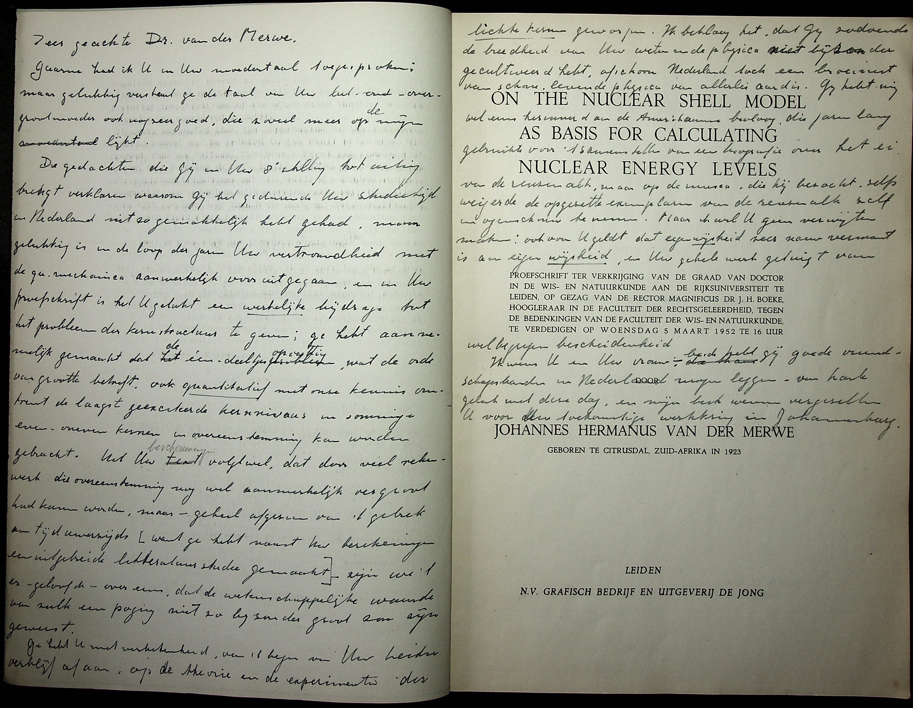 Laudatio uitgesproken door H.A. Kramers op 5 maart 1952, bij de promotie van Johannes Hermanus van der Merwe. Zeer geachte Dr. van der Merwe. Gaarne had ik U in Uw moedertaal toegesproken; maar gelukkig verstaat ge de taal van Uw bet-oud-over-grootmoeder ook nog zeer goed, die zoveel meer op de mijne lijkt. De gedachten die gij in Uw 8ste stelling tot uiting brengt verklaren waarom gij het gedurende Uw studietijd in Nederland niet zo gemakkelijk hebt gehad, maar gelukkig is in de loop der jaren Uw vertrouwdheid met de qu.mechanica aanmerkelijk vooruit gegaan, en in Uw proefschrift is het U gelukt een werkelijke bijdrage tot het probleem der kernstructuur te geven; ge hebt aannemelijk gemaakt dat de een-deeltjesopvatting, wat de orde van grootte betreft, ook quantitatief met onze kennis omtrent de laagst geëxciteerde kerniveaus in sommige even-oneven kernen in overeenstemming kan worden gebracht. Uit Uw beschouwingen volgt wel, dat door veel rekenwerk die overeenstemming nog wel aanmerkelijk vergroot had kunnen worden maar – geheel afgezien van 't gebrek aan tijd uwerzijds [want ge hebt naast Uw berekeningen een uitgebreide litteratuurstudie gemaakt] – zijn we 't er – geloof ik – over eens, dat de wetenschappelijke waarde van zulk een poging niet zo bijzonder groot zou zijn geweest. Ge hebt U met verbetenheid, van 't begin van Uw Leidse verblijf af aan, op de theorie en de experimenten der lichte kernen geworpen. Ik beklaag het, dat gij zodoende de breedheid van Uw weten van de physica niet bijzonder gecultiveerd hebt, ofschoon Nederland toch een broeinest van schone, levende physica van allerlei aard is. Gij hebt mij wel eens herinnerd aan de Amerikaanse bioloog, die jaren lang gebruikte voor 't samenstellen van een biografie over het ei van de reuzenalk, maar op de musea, die hij bezocht, zelfs weigerde de opgezette exemplaren van de reuzenalk zelf in ogenschouw te nemen. Maar ik wil U geen verwijten maken: ook voor U geldt dat eigenwijsheid zeer nauw verwant is aan eigen wijsheid, en Uw gehele werk getuigt van welbegrepen bescheidenheid. Ik wens U en Uw vrouw – beide hebt gij goede vriendschapsbanden in Nederland mogen leggen – van harte geluk met deze dag, en mijn beste wensen vergezellen U voor Uw toekomstige werkkring in Johannesburg. |