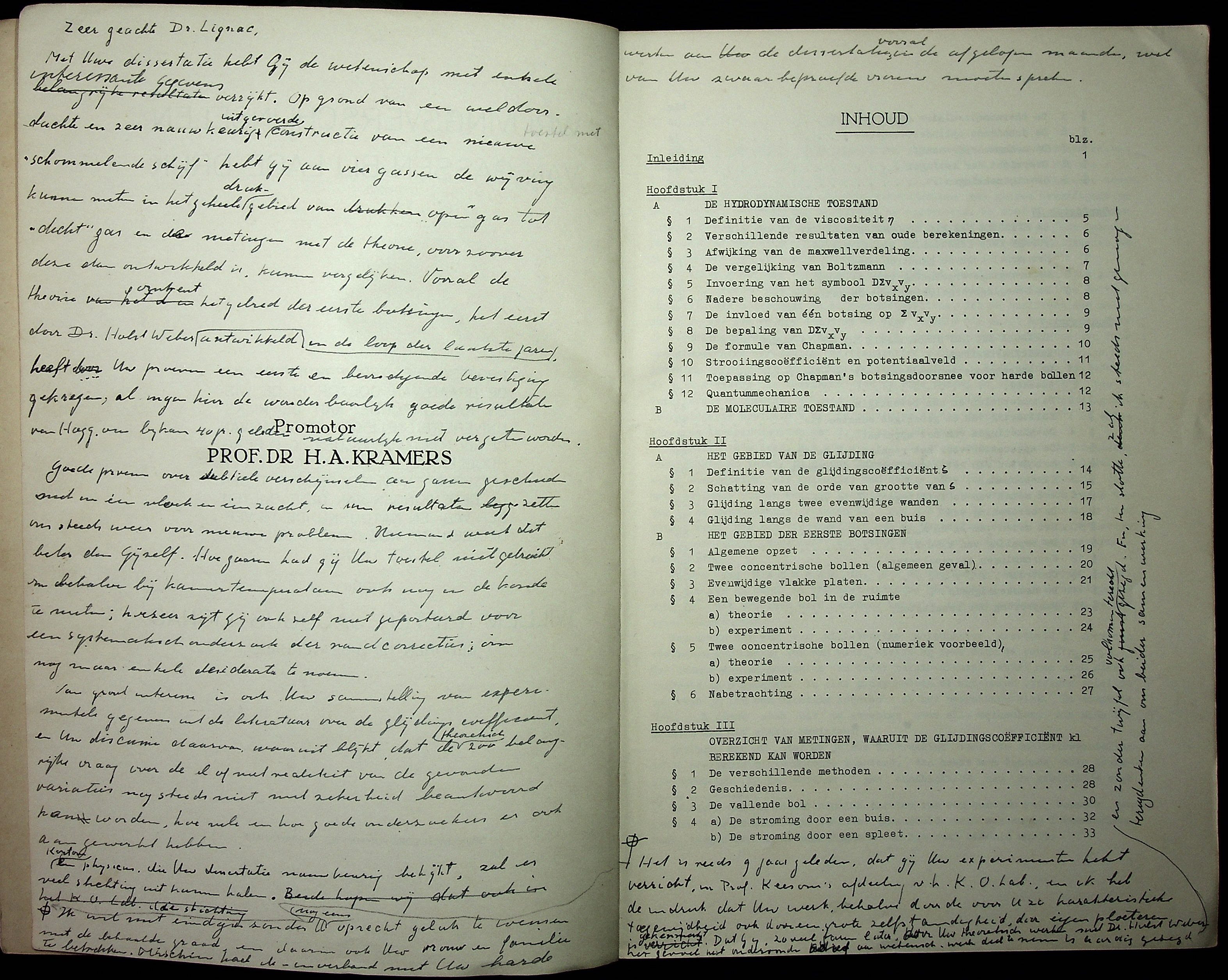 Laudatio uitgesproken door H.A. Kramers op 6 juli 1949, bij de promotie van Willem Pieter Jacobus Lignac. Zeer geachte Dr. Lignac, Met Uwe dissertatie hebt gij de wetenschap met enkele interessante gegevens verrijkt. Op grond van een weldoordachte en zeer nauwkeurig uitgevoerde constructie van een nieuw toestel met "schommelende schijf" hebt gij aan vier gassen de wrijving kunnen meten in het geheele drukgebied van "open" gas tot "dicht" gas en de metingen met de theorie, voorzoover deze dan ontwikkeld is, kunnen vergelijken. Vooral de theorie omtrent het gebied der eerste botsingen, het eerst door Dr. Holst Weber in de loop der laatste jaren ontwikkeld, heeft door Uw proeven een eerste en bevredigende bevestiging gekregen, al mogen hier de wonderbaarlijk goede resultaten van Hogg van bijkans 40 jr. geleden natuurlijk niet vergeten worden. Goede proeven over subtiele verschijnselen aan gassen geschieden niet in een vloek en een zucht, en hun resultaten zetten ons steeds weer voor nieuwe problemen. Niemand weet dat beter dan gijzelf. Hoe gaarne had gij (met) Uw toestel niet getracht om behalve bij kamertemperatuur ook nog in de koude te meten; hoezeer zijt gij ook zelf niet geporteerd voor een systematisch onderzoek der randcorrecties, om nog maar enkele desiderata te noemen. Van groot interesse is ook Uw samenstelling van experimentele gegevens uit de literatuur over de glijdingscoefficient, en Uw discussie daarvan, waaruit blijkt dat de theoretisch zoo belangrijke vraag over de al of niet realiteit van de gevonden variaties nog steeds niet met zekerheid beantwoord kan worden, hoe vele en hoe goede onderzoekers er ook aan gewerkt hebben. Kortom, een physicus die Uw dissertatie nauwkeurig bekijkt, zal er veel stichting uit kunnen halen. Het is reeds 9 jaar geleden, dat gij Uw experimenten hebt verricht, in Prof. Keesom's afdeeling v.h. K.O. Lab., en ik heb de indruk dat Uw werk, behalve door de voor U zo karakteristieke toegewijdheid ook door een grote zelfstandigheid, door eigen ploeteren is gekenmerkt. Dat gij, zo veel jaren later, door Uw theoretisch werk met Dr. Holst Weber het gevoel hebt ondervonden actief aan wetensch. werk deel te nemen, is (door) u aardig gezegd en zonder twijfel ook volkomen terecht gezegd. En, ten slotte, zal ik steeds met genoegen terugdenken aan ons beider samenwerking. Ik wil niet eindigen zonder U nog eens oprecht gelukt te wensen met de behaalde graad, en daarin ook Uw vrouw en familie te bertrekken. Misschien had ik – in verband met Uw harde werken aan de dissertatie, vooral in de afgelopen maanden – wel van Uw zwaarbeproefde vrouw moeten spreken. |