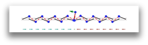 | (S5) Spinner | This movie shows a simulation of the full cycle of a spinner soliton in a chain of 17 rotors. The geometrical parameters of the chain are a = 1, r = 2 and \bar\theta = 1.18. The other model parameters were k_e = 1000, M = 1, and v_0 = 0.04. The green arrows on each rotor are proportional to the angular velocity, and the red and blue arrows underneath depict the x-projections of the rotors, showing the domain wall nature of the soliton. We offset the x-projections of the odd and even-numbered sites to emphasize that the angles of odd rotors and even rotors converge separately to smooth functions differing by a constant. | |