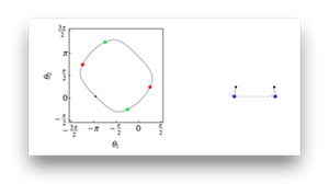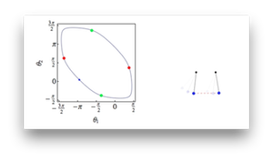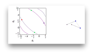 | (S8) Spinner unit cell configuration space | This movie shows a unit cell of a chain in the (non-wobbling) flipper phase and its allowed motion in the configuration space spanned by the two rotor angles. The geometrical parameters of the chain are a = 1, r = 2 and \bar\theta = 1.18. | |