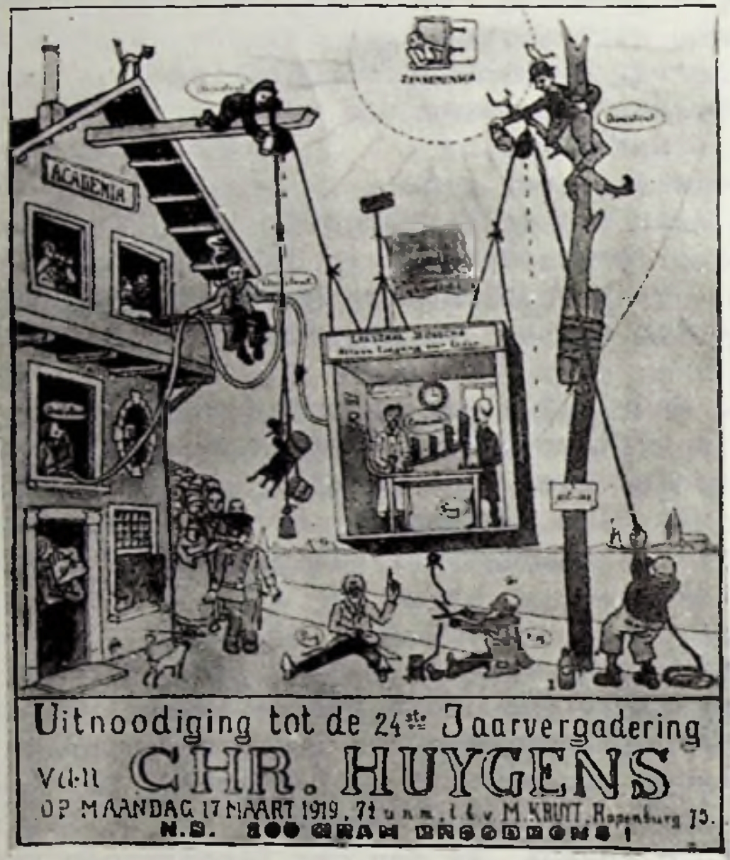 The debating society "Christiaan Huygens" was founded in 1895 by students in the natural sciences. (It existed informally since 1888.) When Paul Ehrenfest arrived in Leiden 1912 he took an active interest in the society, as a means to engage students more intensively in recent scientific developments. It would count several distinguished scientists among its members. The society met every two weeks for seminars on a broad range of topics. The students would write out their text in a booklet, some 200 of these are preserved in the archives of the society (now at the University Library). Here is a collection of pointers to the history of the "Dispuut Christiaan Huygens" (in Dutch).