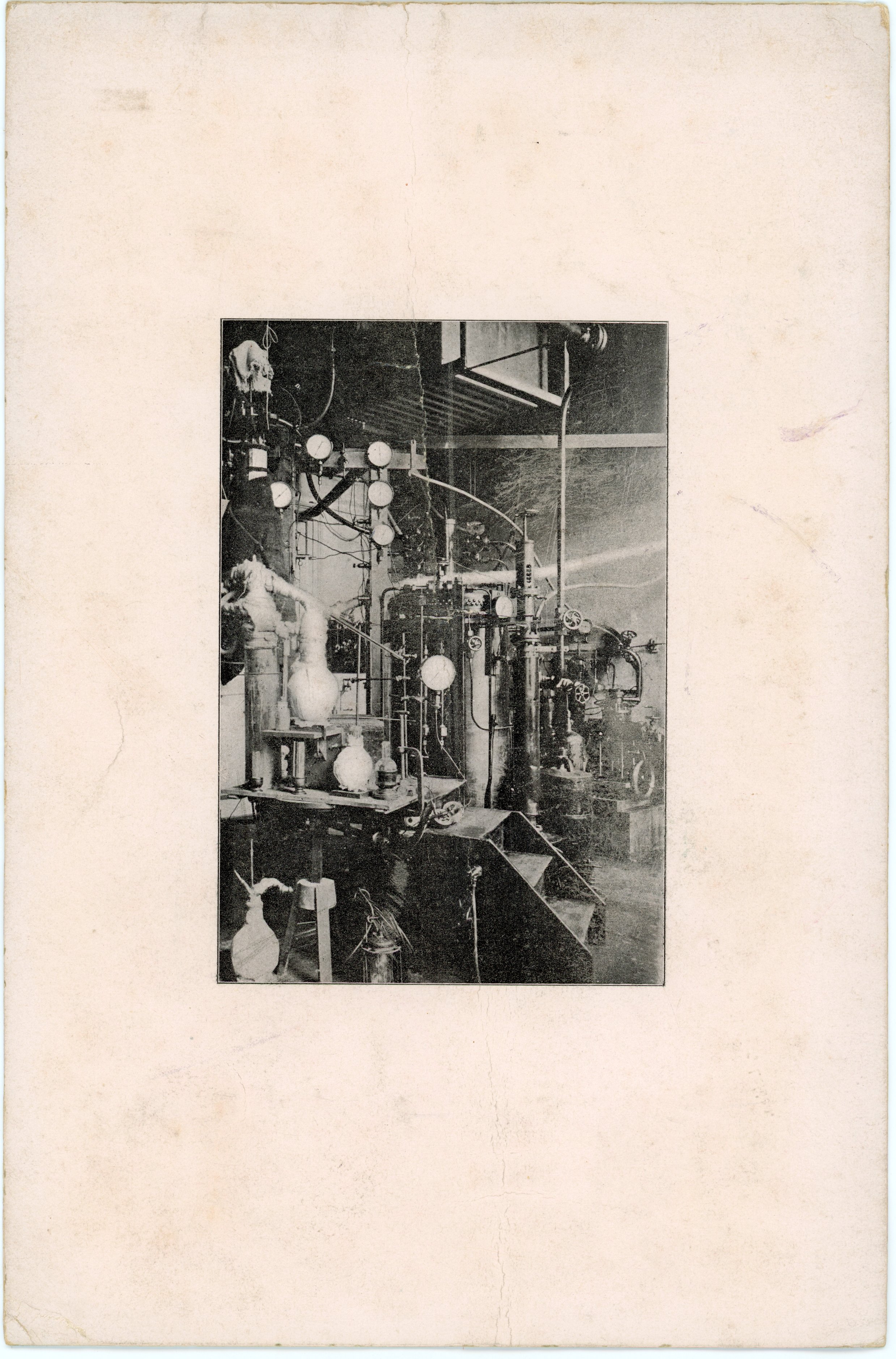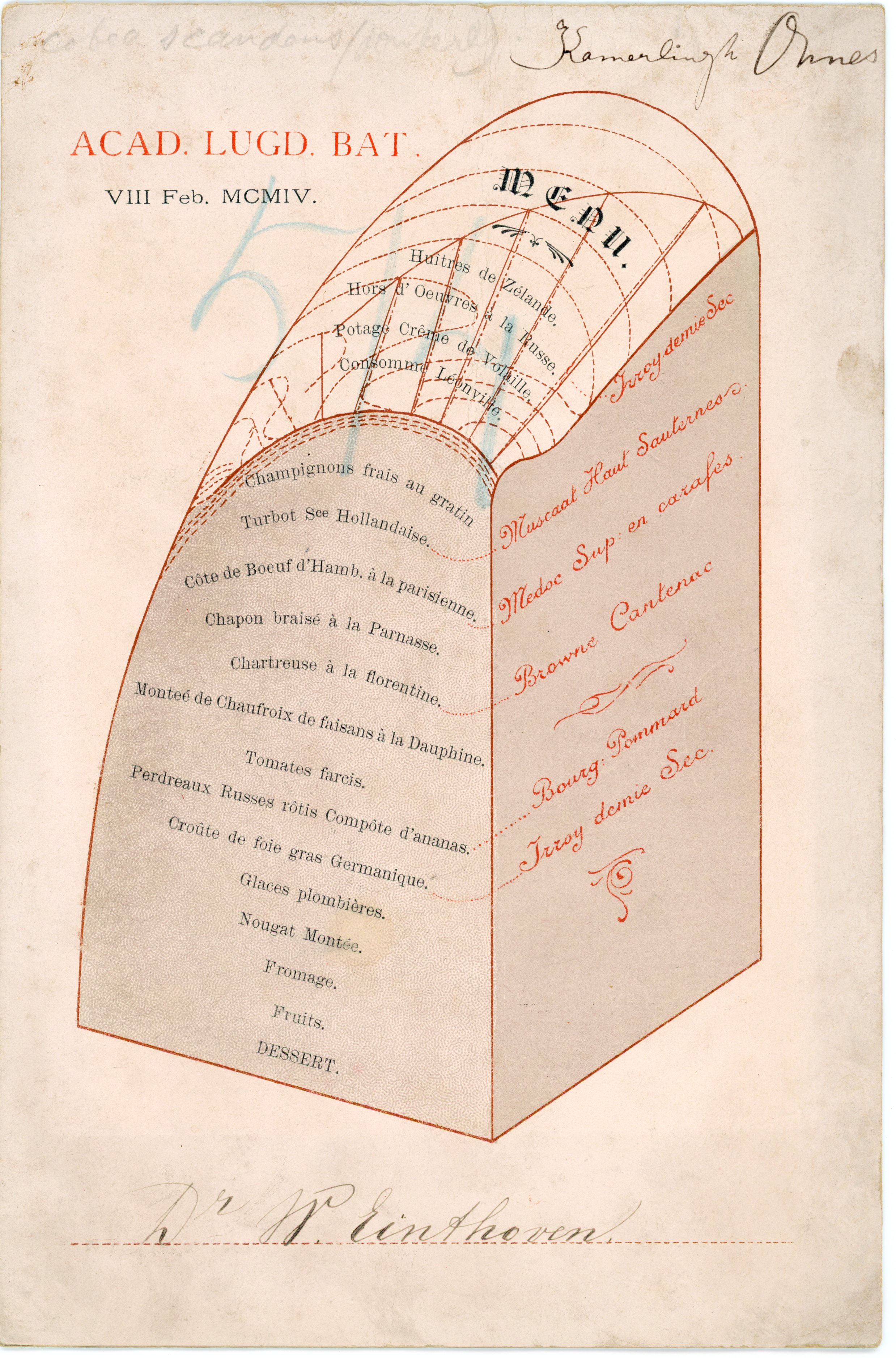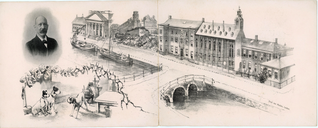 The menu that accompanied the Senate dinner on 8 February 1904, with Heike Kamerlingh Onnes as rector, had a distinctly scientific appearance. Dishes and wines, from "Huitres de Zélande" and "Irroy demie Sec" to Croûte de foie gras Germanique" and "Bourg Pommard, were printed on a Gibbs surface, which had recently been manufactured from plaster in the Physics Laboratory. Also on the menu was a drawing of the Rapenburg with, side by side, Onnes's parental home on the Noorderhaven, the Groningen Academy Building, the ruins of Heidelberg Castle, the Polytechnic School on the Oude Delft, the Leiden Academy Building and the Physics Laboratory — a drawing by Menso. On the back was Heike doing swing tests in his "cyclops cave" under the watchful eye of dogs, and a photo of room E with the cascade for liquid oxygen.