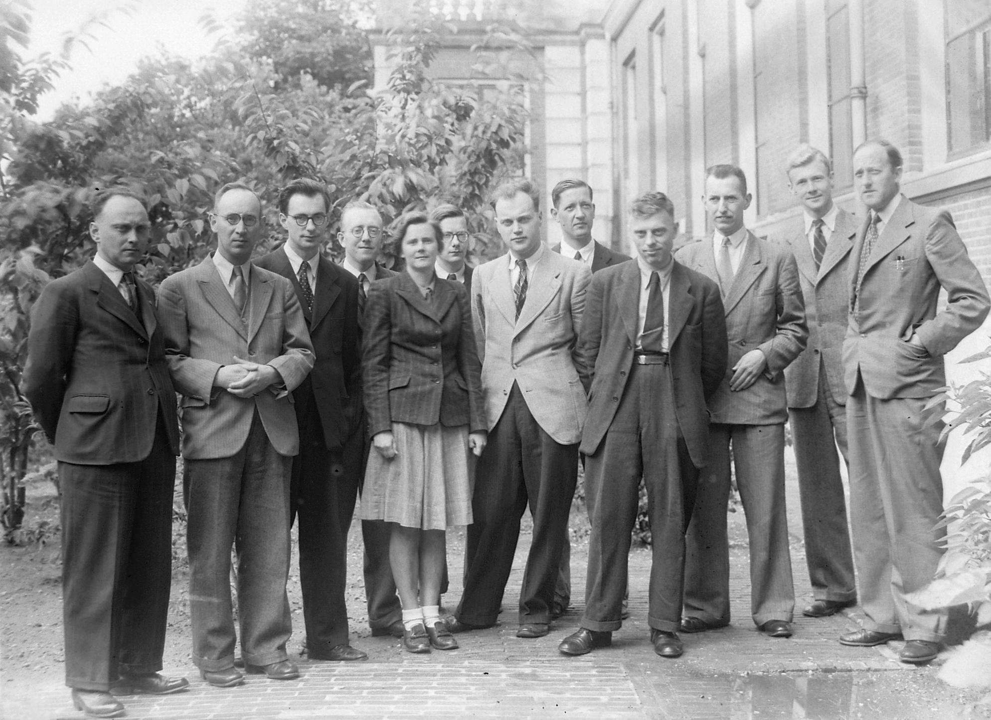 groep oude assistenten in tuin, 1948
