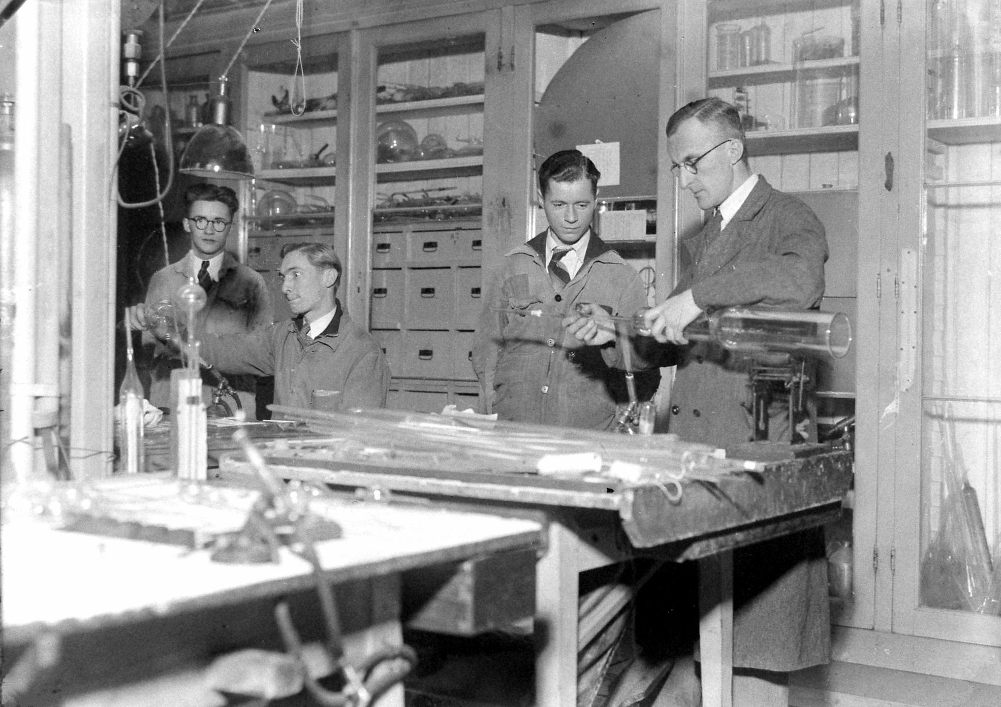 v.l.n.r. de leerlingen de Water, Nieuwenhuizen, Voorzaat en meester Gerritsen in de kleine glasblazerij.