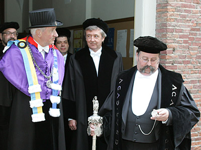 Rector Douwe Breimer, met de versierselen van zijn zeven eredoctoraten,