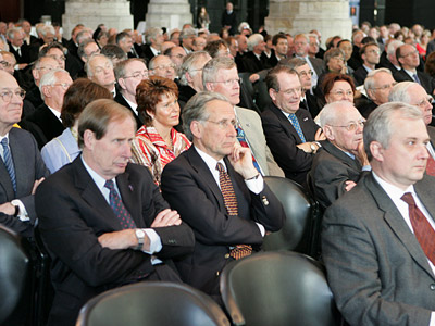 Een volle Pieterskerk luistert aandachtig toe.