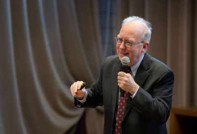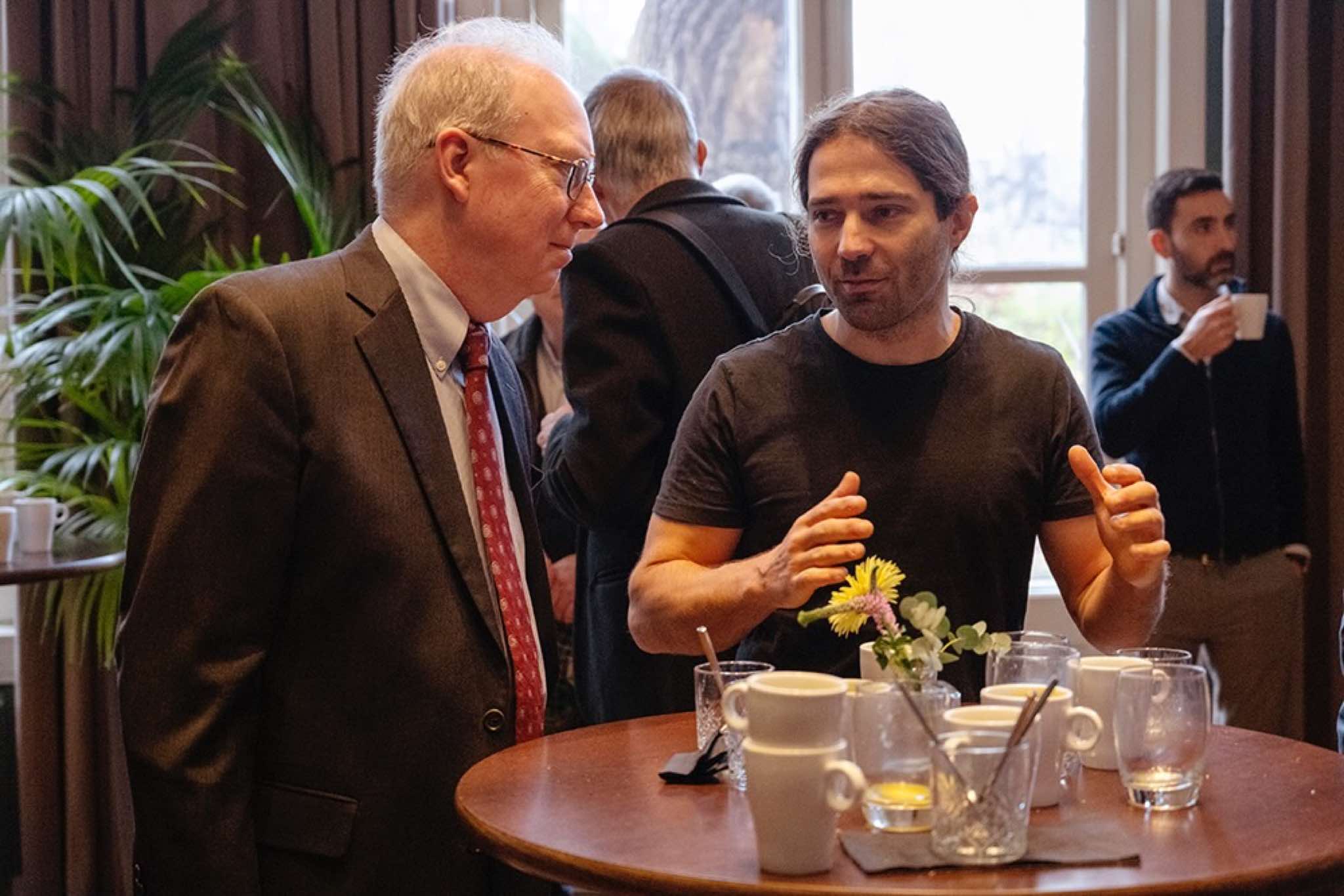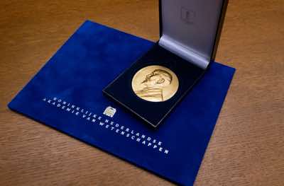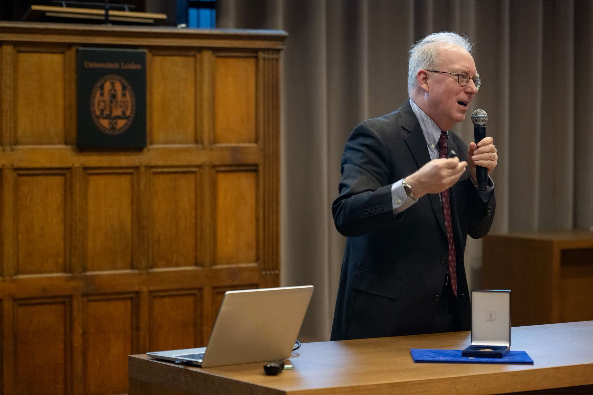 The vice-president of the Royal Netherlands Academy of Arts and Sciences, Lodi Nauta, and the chair of the jury, Robbert Dijkgraaf, hand over the Lorentz Medal to Charles Kane.
